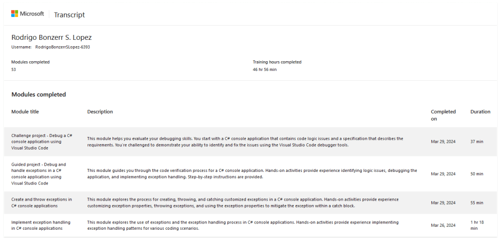 As a final conclusion, I believe this certification is a really good addition to my skill set. Throughout the course, I learned a lot of new tips and tricks with the C# language and some concepts related to debugging. There were a lot of new terms that I’ve encountered about the language and it gave me more ideas on how to use the C# programming language.